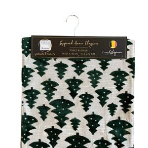 Add a touch of luxury to your holiday table with the Soho Studio Green Velvet Christmas Tree Table Runner. Measuring 16" x 90", this exquisite runner features a festive velvet Christmas tree design, perfect for creating a warm and inviting atmosphere. Woven in Belgium, its premium velvet construction brings elegance to your seasonal décor. Brand new and easy to maintain with spot cleaning, this table runner is a stunning addition to any holiday celebration. Mackenzie Childs Inspired.