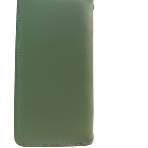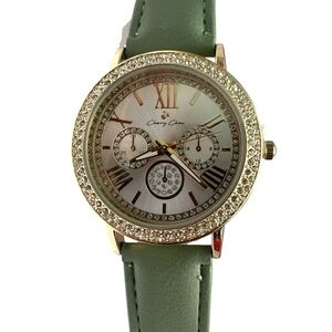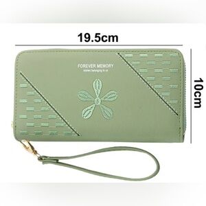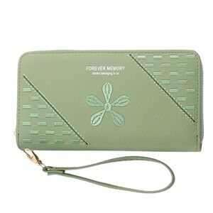 Coordinated green wallet and watch set by . Wallet features embossed floral detail for a feminine touch. Watch has a green leather strap and gold-tone case for a polished finish. Stylish green set ideal for everyday wear or gifting.