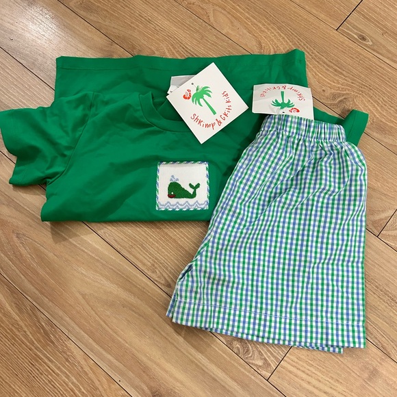 Adorable matching set featuring a vibrant green top with a cute whale design. Paired with stylish green and white checkered shorts, this set is perfect for playful days.