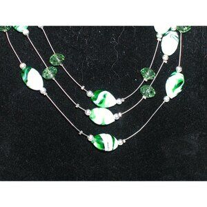 This multi-strand necklace features green and white glass beads with an adjustable silver lobster clasp, offering a stylish and secure fit.