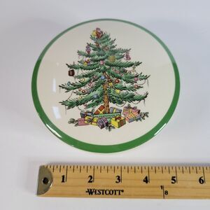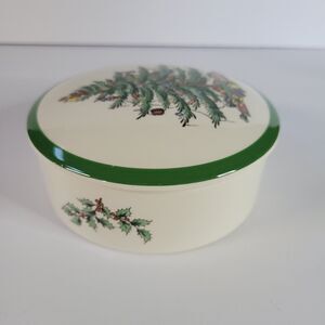 Green White Spode Christmas Tree Porcelain Round 5” Trinket Powder Box England