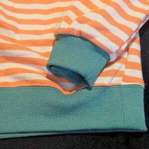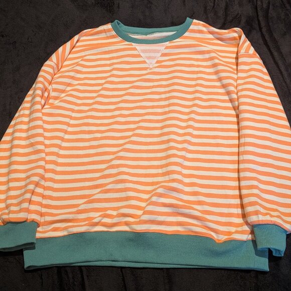 Size large. orange and white striped sweater with green detail. 46 inches wide and approx. 26 inches long, it's also very stretchy. Worn a few times, has wrinkles from storage and some wear and pilling inside the sweater, I did not notice any stains.