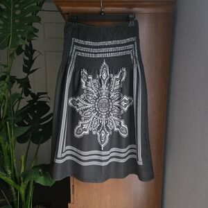 Green With White Pattern Midi Skirt Size Medium With Smocked Waist. looks more grey in the pics. I believe you could also wear as a strapless mini dress if you want to. showing a few slight fabric pulls. no size, fits like medium