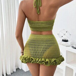 Green Women's Halter Crop Top And Ruffle Hem Mini Skirt Beach Cover Up Set