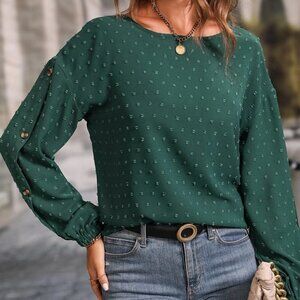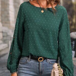 Green Preppy Womens Swiss Dot Bishop Sleeve Blouse
