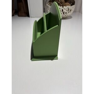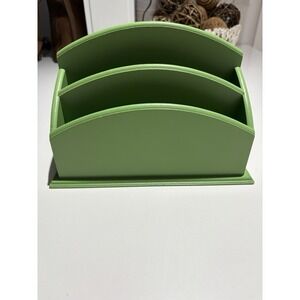 Keywords: desktop organizer, mail sorter, letter holder, office supplies, desk storage, green wooden organizer, home office decor, desk accessories, paper organizer, office organization, vintage desk organizer