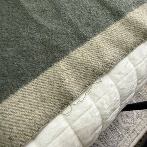 Two-tone wool blanket with a heathered green field and light gray border, offering a classic, cozy wool look and feel.