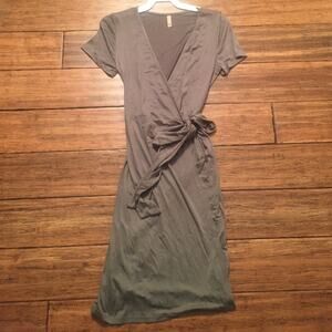 Adorable wrap dress in olive. Great for work or a night out! This jersey knit wrap dress features short sleeves and a v-neckline. 95% rayon / 5% spandex.