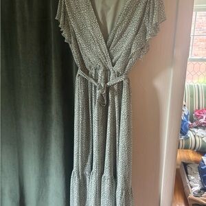 This charming green sundress features a wrap-style bodice with a v-neckline and short flutter sleeves. The tiered, ruffled skirt adds a playful touch, making it perfect for casual outings or resort wear. Crafted from a light, floaty fabric, it offers a breezy and comfortable fit.