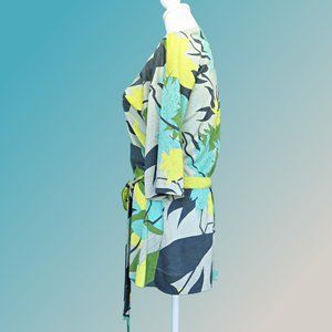 Floral Tunic created using a blend of silk and cotton, this top is luxuriously soft and comfortable. Pucci designs usually are abstract geometrics and swirls. This large floral print done in soft colors of light green, aqua, yellow and dark gray is a rare pattern.