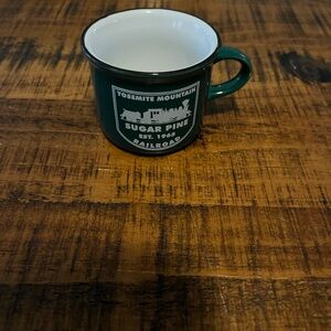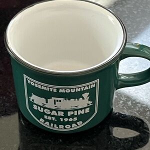 Enjoy your favorite beverage in this stylish green mug featuring the Yosemite Mountain Railroad design. Perfect for adding a touch of adventure to your home dining experience.