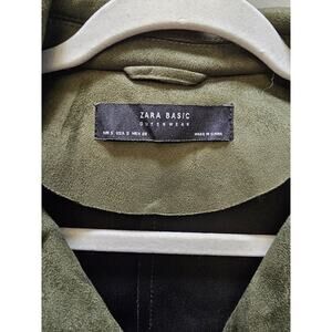 Army green color Zara Basic Outerwear zip moto jacket with pockets and belt size small. Silver color hardware, suede like fabric, good amount of thickness but I wouldn't consider this to be super warm, great for fall.