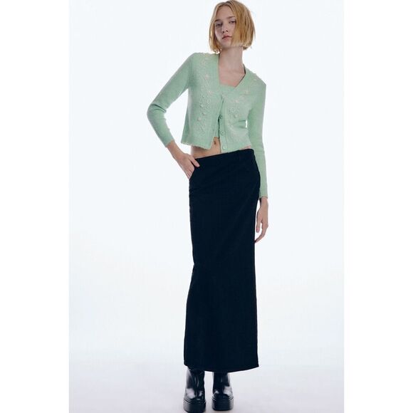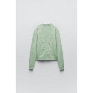 Green Zara Pearl Embellished Button Front Long Sleeve Cardigan Sweater (NWT)