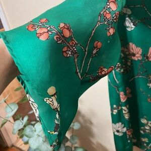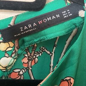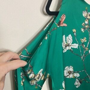 Stunning royal green satin feel dress by Zara . size M . slight bell sleeve . beautiful magnolia floral print. cut out on arms, cold shoulder design. EUC no condition flaws.