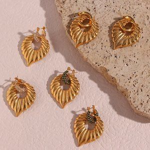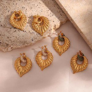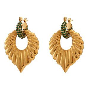 Green Zircon Micro Pave Chunky Palm Leaf Drop Statement Earrings With 18K Gold Plating.