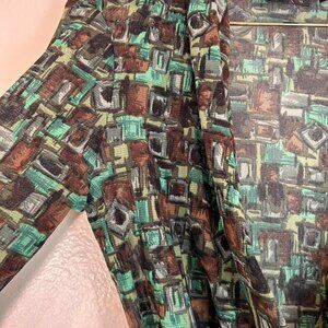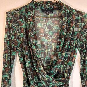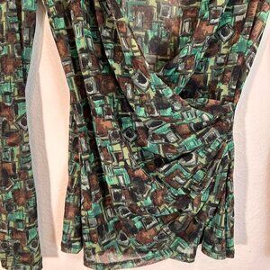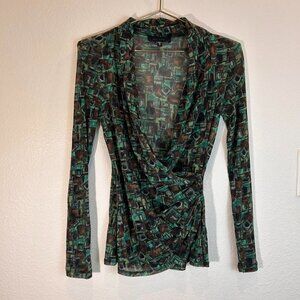 Green abstract print retro 70s vibe long sleeved wrap style top