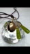 This exquisite necklace showcases a gold bead encased within a clear disc, accentuated by delicate green elements. Its minimalist design is completed with a fine chain, offering a contemporary touch to any ensemble.
