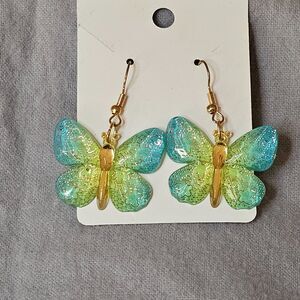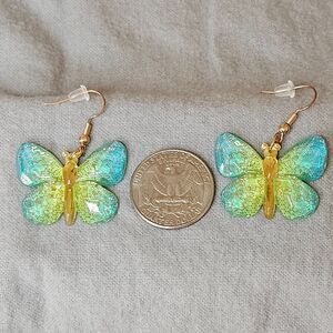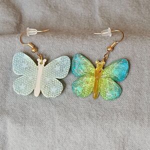These exquisite earrings feature delicate butterfly designs with a captivating ombre effect, transitioning from green to blue. Crafted from a lightweight, translucent material, they beautifully mimic the natural texture of butterfly wings. Perfect for adding a touch of elegance to any ensemble.