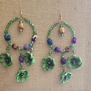 Elegant hoop earrings featuring vibrant green and blue floral palm designs. Perfect for adding a pop of color to any outfit.