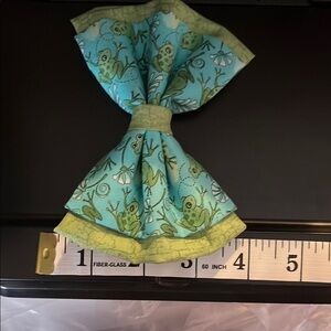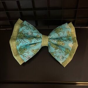 Charming hair bow with a playful frog pattern. Features green and blue colors.