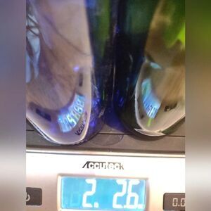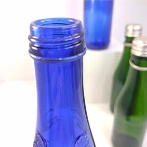 Green Glass Bottles with Silver lids/caps lot of 2 & Blue Glass Bottles with logo screw on metal lids/caps