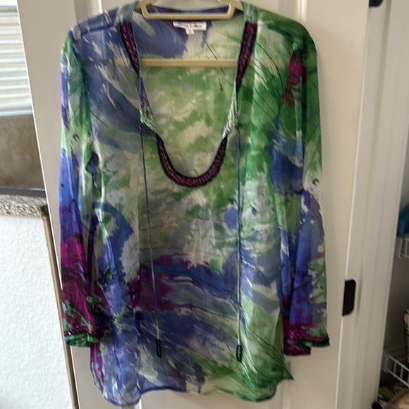 This gorgeous cover up features a vibrant blend of green and blue hues in a graphic, watercolor-style print. Designed with a relaxed fit and long sleeves, it offers a comfortable and stylish look. The soft, flowing fabric drapes beautifully.