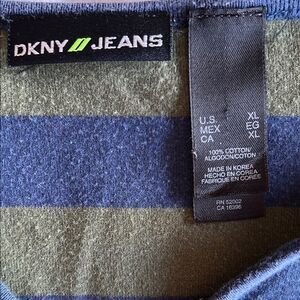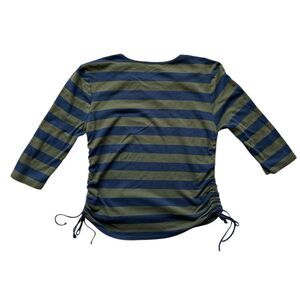 This casual 3/4 sleeve tee features a crewneck notched neckline, curved hem, and adjustable drawstrings down the sides for a cinched look. Made from a soft cotton in a green and blue striped pattern. It has minor pilling but no flaws. Approximate measurements lying flat: pit to pit 18”, total length 23“. Let me know if you have any questions! Feel free to contact me during a closet clear out event (Fridays and Sundays) if you’re interested in a 10% discount and $4.99 shipping on this item, or bundle with other items for greater savings. Please note that I reuse shipping materials whenever possible ♻️
