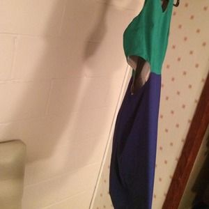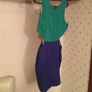 Green and Blue Sleeveless Cocktail Dress; Open Holes (Circles) on both sides at waist. Knee length. Never worn.