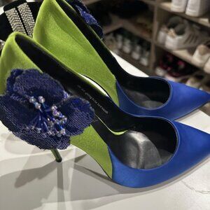 Featuring a pair of green and blue stiletto pumps in silk satin base with a hand embellished sequined flower. It has a vegan leather underlining and a metallic 4.5 inches heel.