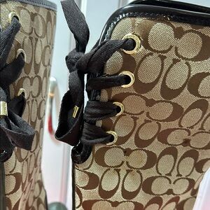 Excellent preowned condition. Two small spots, I have not tried to get them out) Stay stylish and dry with these Coach Signature rain boots in a classic green and brown color combination. The durable and waterproof design makes them perfect for rainy days and winter weather. Add a touch of luxury to your rainy day outfit with these signature patterned boots.