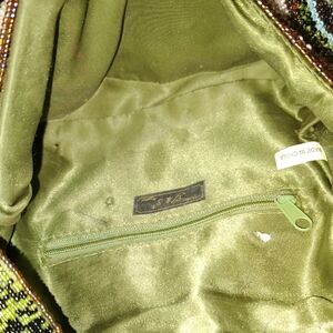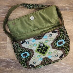 This crossbody bag showcases a harmonious blend of green and brown hues, adorned with intricate geometric patterns. Its crescent shape and textured finish add a touch of elegance, while the vibrant turquoise embellishments provide a striking contrast.