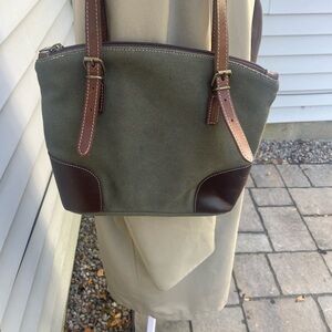 Stylish olive green and brown shoulder bag with leather accents. Perfect for everyday use. Y2k style and in very good co dorian. Ideal for a fall outfit