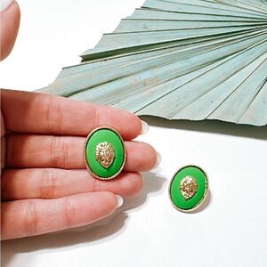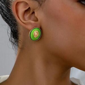 Elegant green and gold earrings featuring a striking lion emblem. Perfect for adding a bold touch to any outfit.