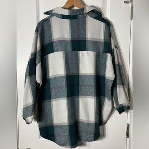Casual cozy plaid shacket with green and gray tones. Ideal for everyday wear.