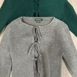 Stylish ribbed cardigan tops in green and gray. Features a tie-front design. Sold together.
