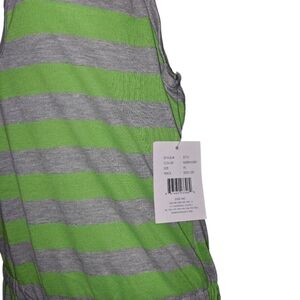 Stylish sleeveless dress with green and gray stripes. Features a tie detail at the neckline.This eye catching swimsuit cover up by EXIST Miami is striped with heather gray and neon green stripes. It has a drawstring around the waist. It is lightweight. This cover up is new with tags $50