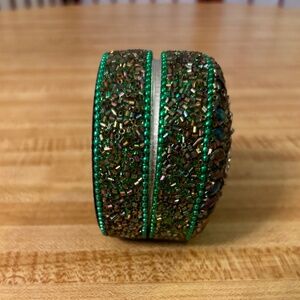 This Green Beaded and Clear Rhinestone Gift Box Small is in very good pre-owned condition. All beads and rhinestones appear intact, interior is metal.
