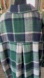 Stylish green and navy plaid long coat. Features button closure. No side pockets. Long and warm