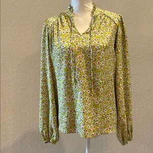 This relaxed blouse features a mandarin collar and a tie front, offering a flowing silhouette with billowy long sleeves. The soft yellow and green hues complement the delicate floral print, creating a vintage-inspired look. Sz Sm