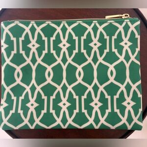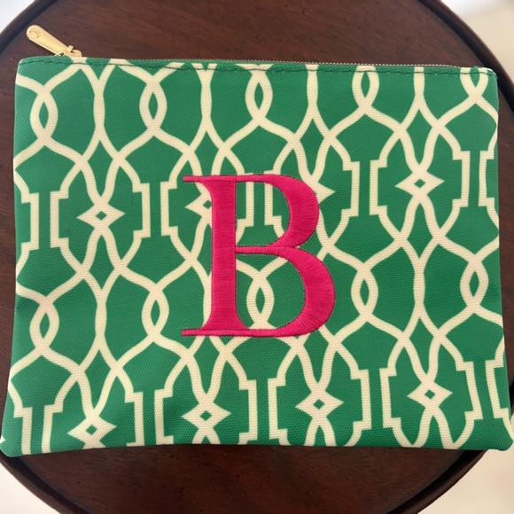 Green pouch with a pink embroidered letter B design. Great for organizing essentials.
