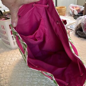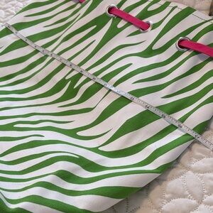 Stylish and vibrant, this green and pink zebra print tote bag is perfect for adding a pop of color to your outfit. Ideal for everyday use, it combines fashion with functionality. It is 100% coated cotton on the outside with instructions to wipe down with a wet cloth for cleaning and 100% cotton interior. Some slight signs of wear on the exterior. Overall clean and in great condition.