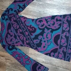 Green and Purple A-line Wrap Dress with 3/4 Sleeves and V-neck