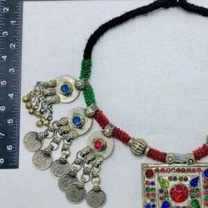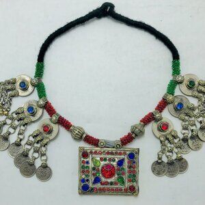 This beaded ethnic tribal jewelry piece comprises of a huge intricate crafted pendant in the center beautified with multi-hued glass stones. Beautiful tiny tribal coin pendants pop on the sides of this necklace with their beautiful bright glass stones. Dangling rhythmic tassels are attached to every pendant of this necklace. Delicate beadwork of green and red color is wrapped around the cotton cord on this necklace.