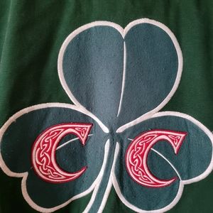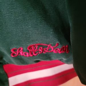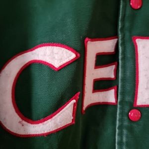 Stylish green varsity jacket with red accents, perfect for a sporty look.