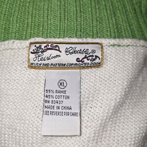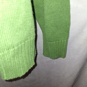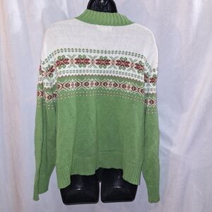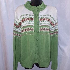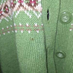Embrace the warmth and charm of this green and white cardigan, featuring a classic Fair Isle pattern. The cozy knit and traditional design make it a perfect choice for chilly days. Enjoy the blend of style and comfort in this timeless piece. has a small stain please see pictures pit to pit size is 22.5 top of shoulder to bottom hem is 24.5 " bundle more items for bigger deals Bin-146