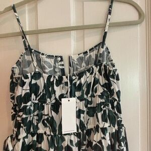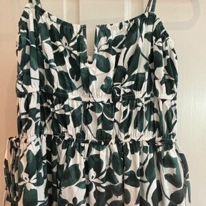 Moon River cotton maxi dress with very pretty and classic leaf pattern in dark green color. Three tiers, ties on sides, stretchy up top and adjustable straps. Looks great on! Never worn, beyond trying it on. Would fit women size 4-8, depending on bust size.