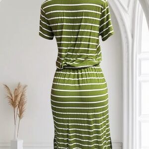 This casual midi dress features a classic green and white striped pattern, short sleeves, and a crew neckline. Its sheath style offers a flattering fit, enhanced by a tie detail at the waist for added definition. Perfect for everyday wear, the dress is crafted from a soft, stretchy knit material for comfort and ease.