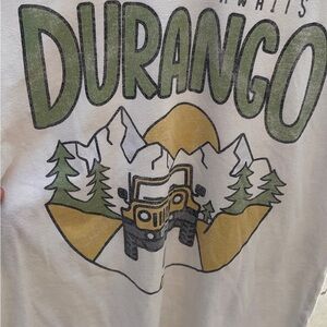 This short sleeve tee showcases a captivating Durango design in green and white, ideal for everyday wear. The graphic features a circular emblem with mountain scenery, exuding a nostalgic and adventurous charm. Made for comfort, this tee is a versatile addition to any collection.