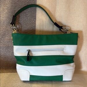 This stylish shoulder bag showcases a vibrant green and white color palette, ideal for elevating your daily ensemble. Its sleek, modern design is complemented by a durable construction, ensuring longevity and practicality. The bag's distinctive horizontal stripe pattern and comfortable strap make it a versatile choice for any occasion.