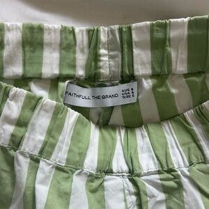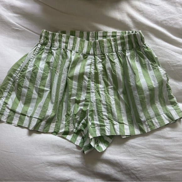 Chic high waist shorts with sage and white stripes. Perfect for a stylish casual look.